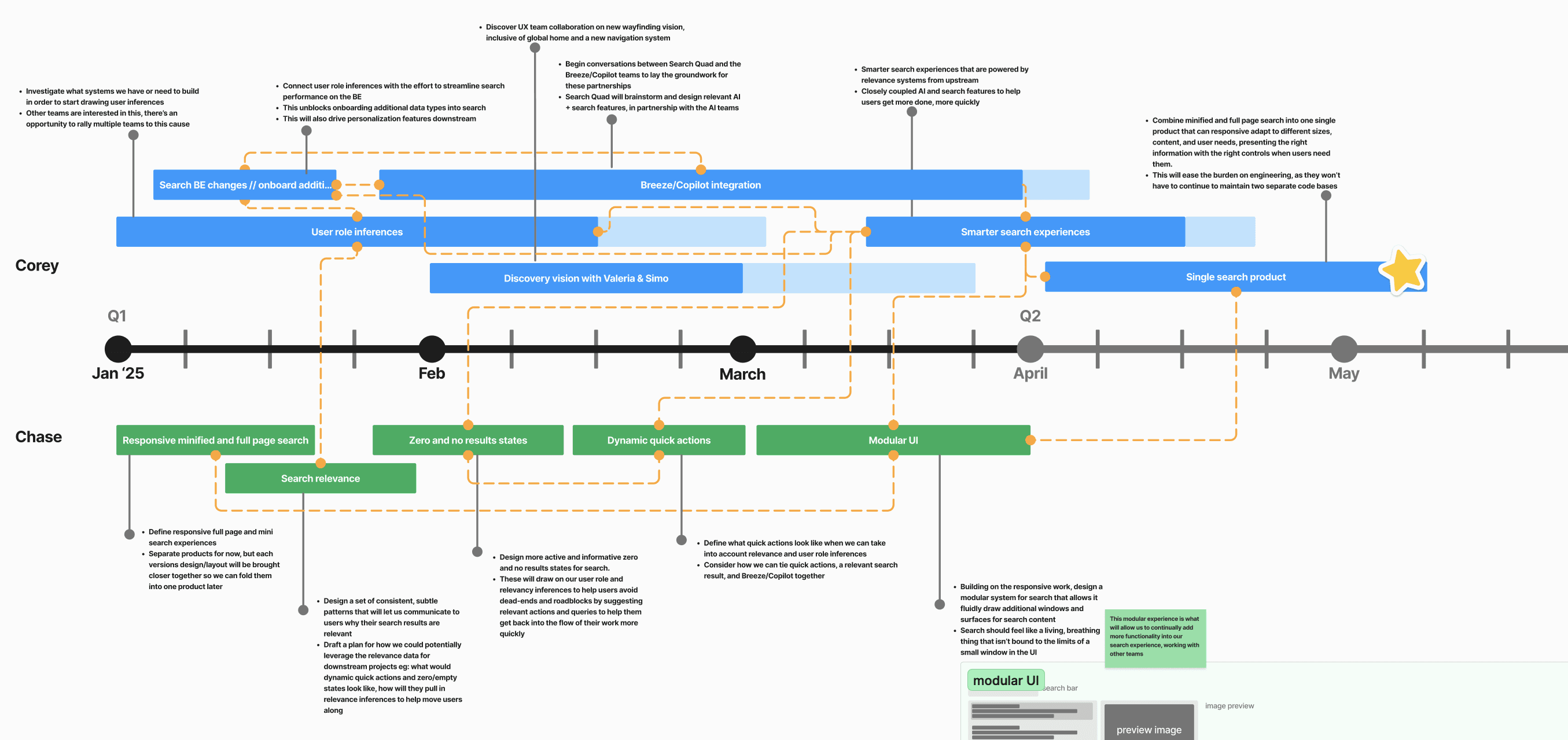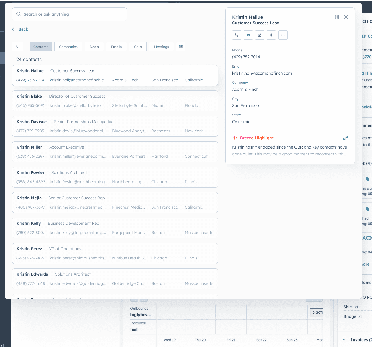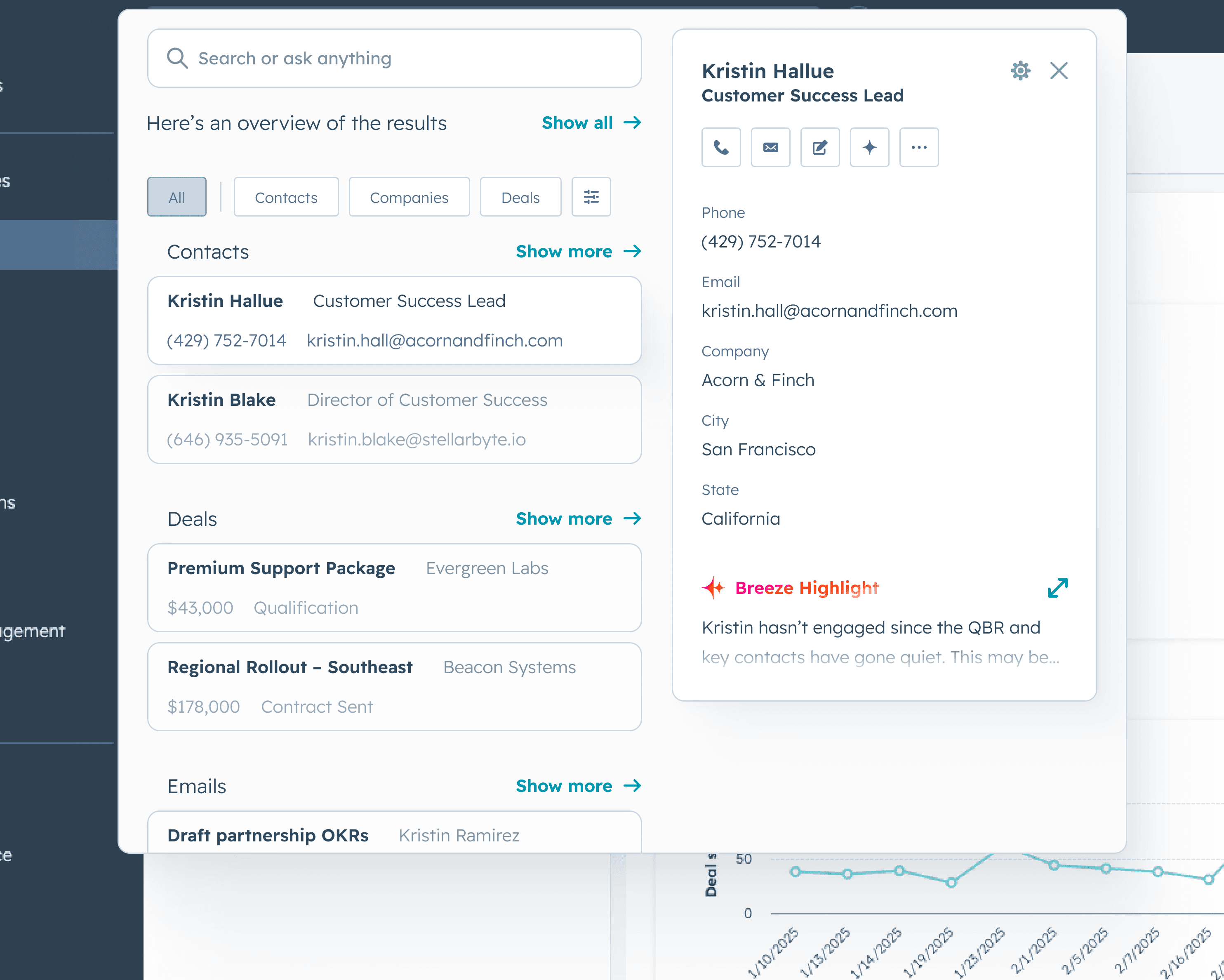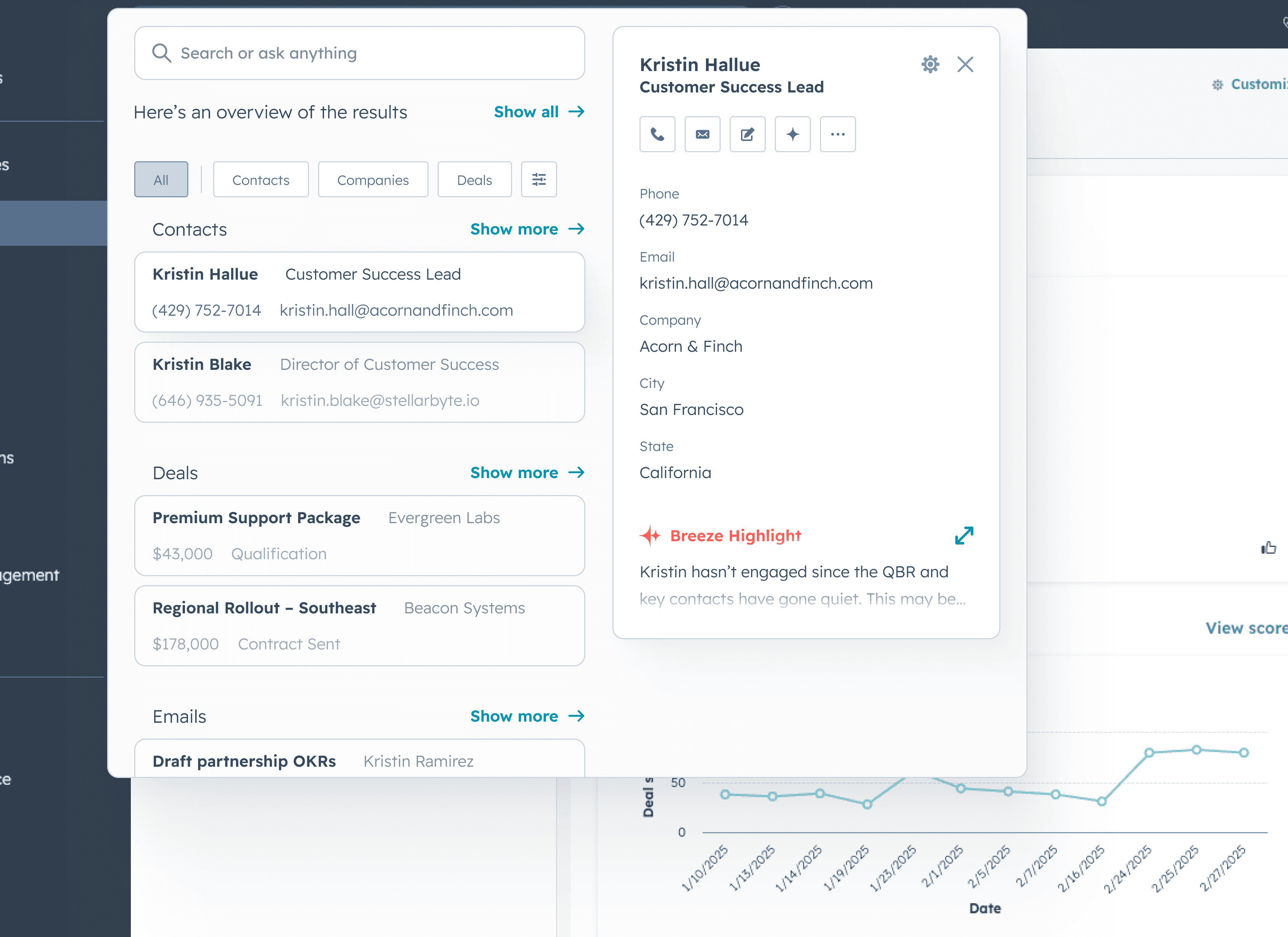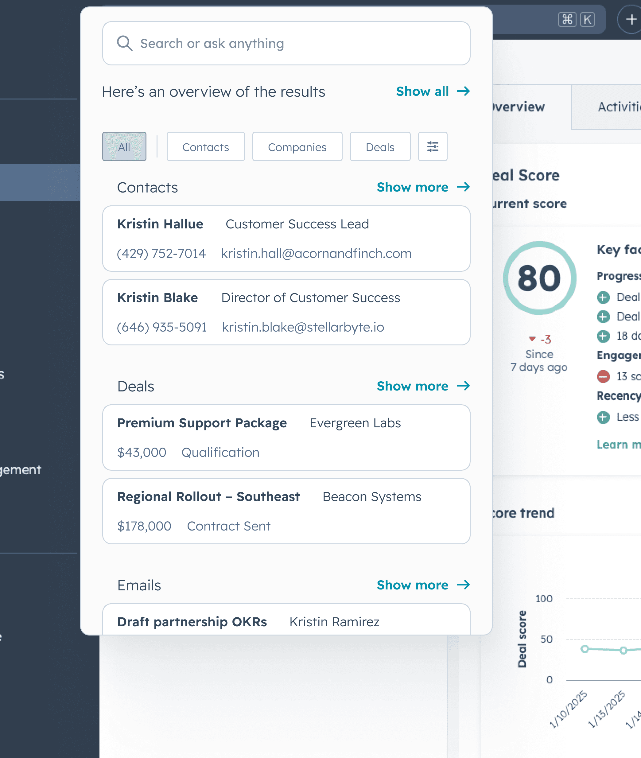 Our most immediate major risk was that we were hardware-limited and couldn't index more areas of HubSpot for search. I led a partnership with another platform team to build a backend service that could pass in context about our user's job role so we could sharpen our search strategy. The result was improved result relevance, the ability to enrich search results with AI insights, and a wider scope of indexed data without additional infrastructure spend.