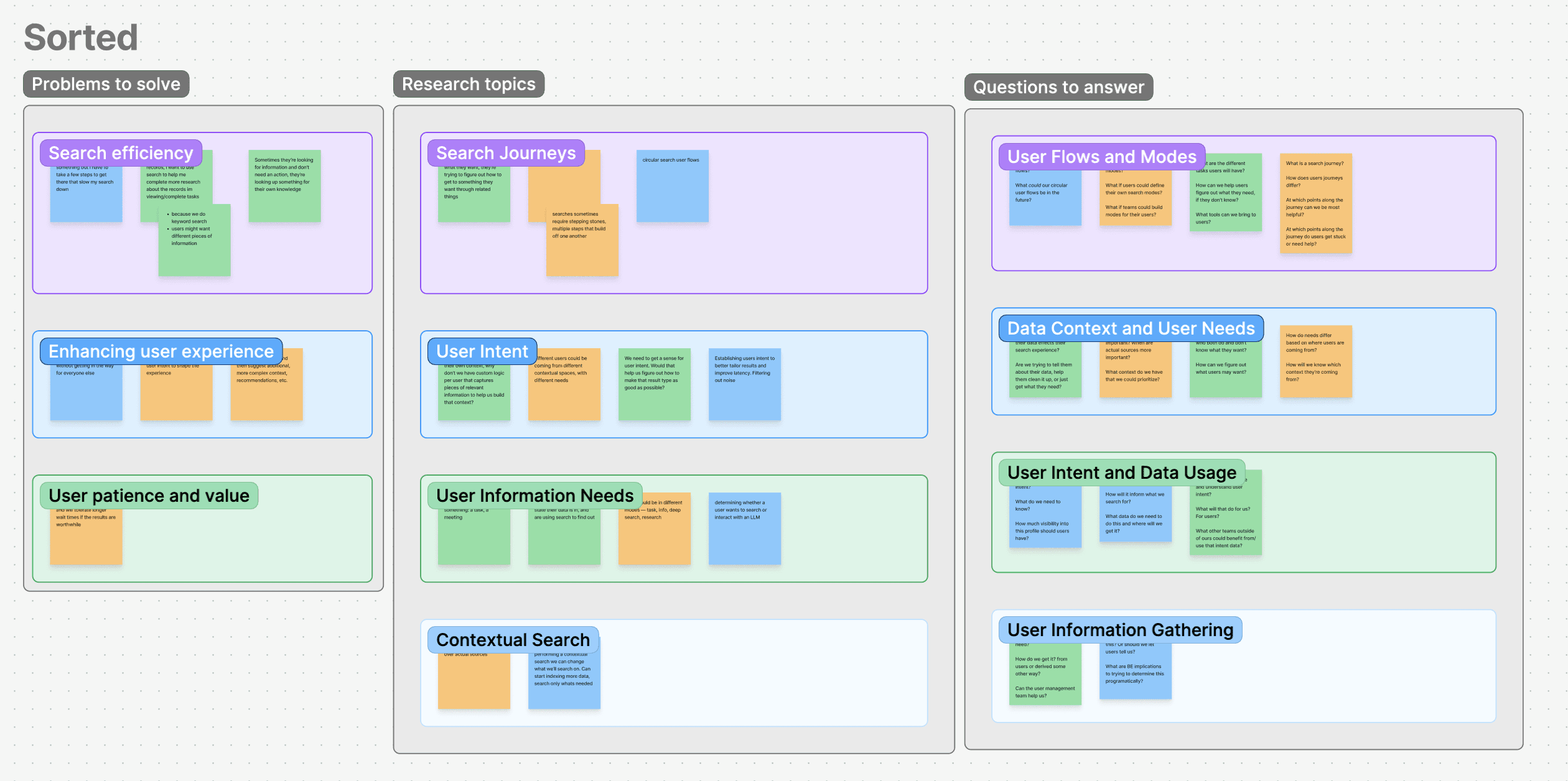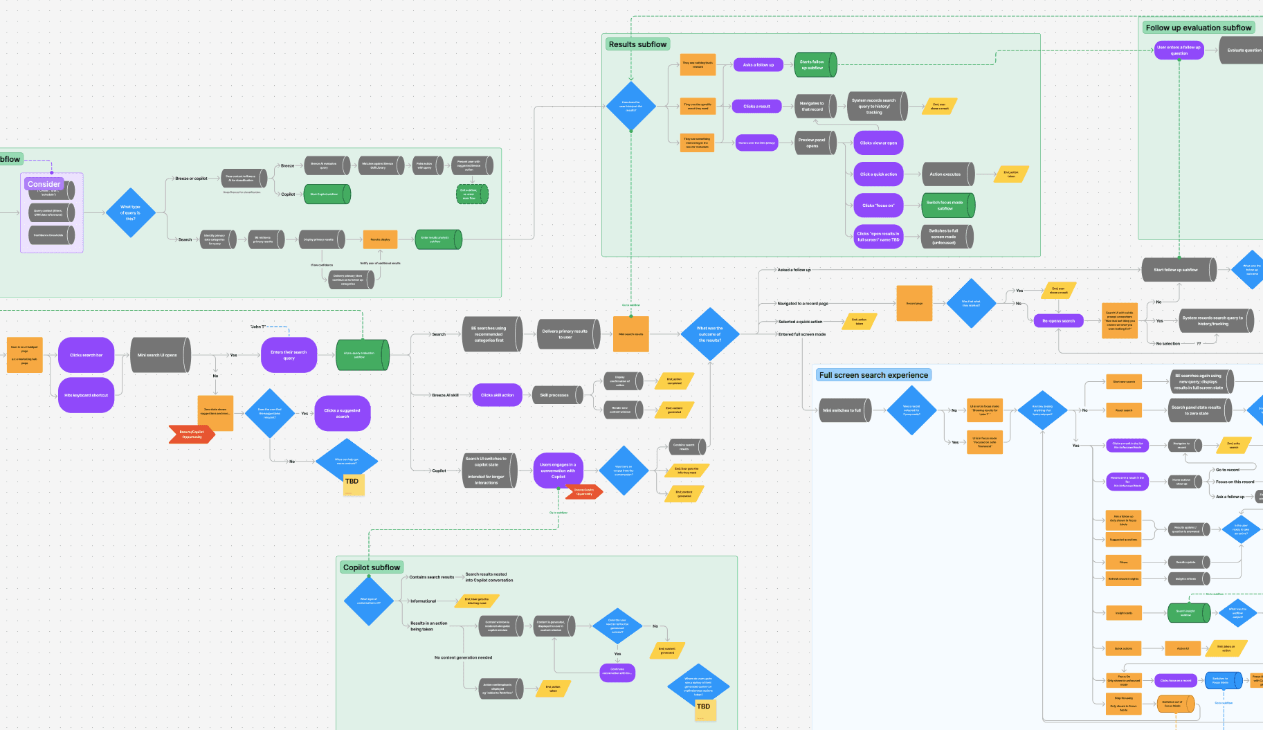I translated what I had learned about the product into a systems map that connected user flows to the backend and AI capabilities required to support them. The map made dependencies visible, so we could make realistic tradeoffs and avoid designing features the system couldn’t deliver (ex: a chat-based search UI with scoped follow-up queries).